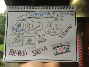 Klänge indischer Musik haben uns geweckt. Alle waren schnell wach und fertig für den Frühsport. Als diese Hürde auch gemeistert war, gingen wir zum Frühstück. Der nächste Programmpunkt war Plenum. Heute haben wir etwas über den Hinduismus gelernt. Eigentlich hatten wir jetzt einen special guest, doch er war verspätet, deswegen haben wir das singen vorgezogen. Als unsere Gäste dann doch eintrafen, ein Hindu mit seinen 2 Kindern und seiner Nichte, konnten wir ihm Fragen stellen. Nach dem Mittagessen und der Mittagsruhe, in der ein Fußballspiel der Teams Team Ex gegen Fresher Than You, das Team Ex gewonnen hat, sind wir jetzt in unseren Pflichtprojekten, welche unterbrochen wurden von einem Besuch in einem „Tempel“, wo wir gelernt haben, wie täglich in einem hinduistischen Haushalt gebetet wird. Auf dem Tagesplan stehen noch Freizeitprojekte und ein Film aus Hohenfelde anschauen.