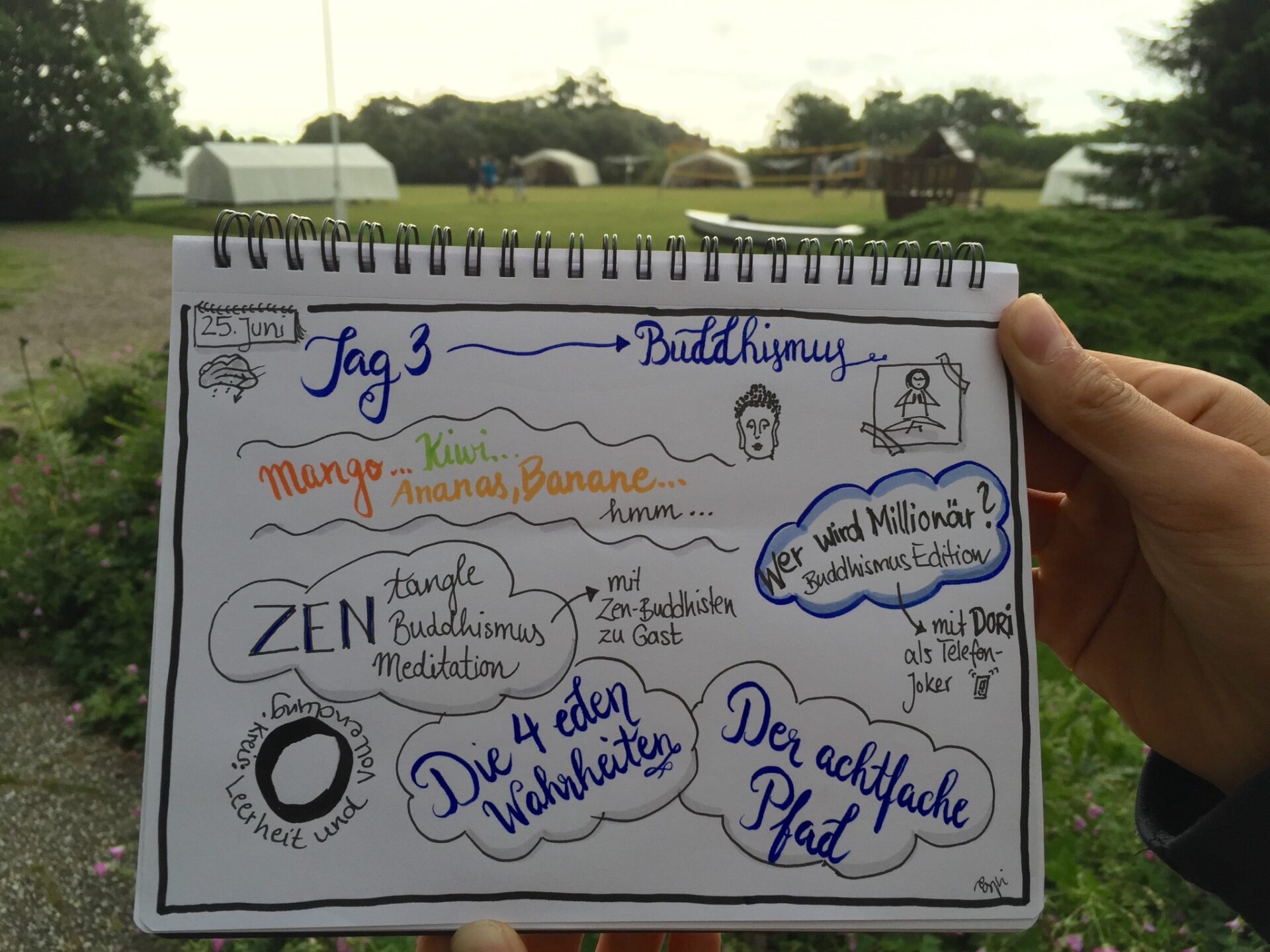 Heute wurden wir vom Regen geweckt, der gegen Zeltwände und Zimmerfenster schlug. Nachdem wir mit klappernden Zähnen vom Frühsport kamen, gab es dann endlich Frühstück. Es ging sofort weiter mit dem Plenum, heute in Form der „Wer wird Millionär? Buddhismus Edition“ und einem kurzen Film über das Leben in einem thailändischen Kloster. Der Buddhismus fand bei uns deutlich mehr Anklang als der Hinduismus oder die Naturreligionen, wahrscheinlich wegen seiner sehr liberalen Regeln. Nach dem Plenum wurden auf Zimmern und Zelten mehr oder minder Buddha-Figuren geknetet. Während der Mittagsruhe fing es leider an zu regnen, weswegen das für heute geplante Fußballspiel verlegt werden musste. Am Nachmittag durften wir vier Zen-Buddhisten aus Kiel empfangen, mit denen wir auch meditierten. Mit dem Rest des Tages konnten wir dank Regen und Gewitter nicht viel mehr anfangen als in unseren Zelten und Zimmern zu sitzen und auf gutes Wetter zu hoffen. Im Laufe des Tages kam dann auch der letzte in Hohenfelde an: Kantor Rolf Quandt, der bis Dienstag das alltägliche singen leiten wird.
