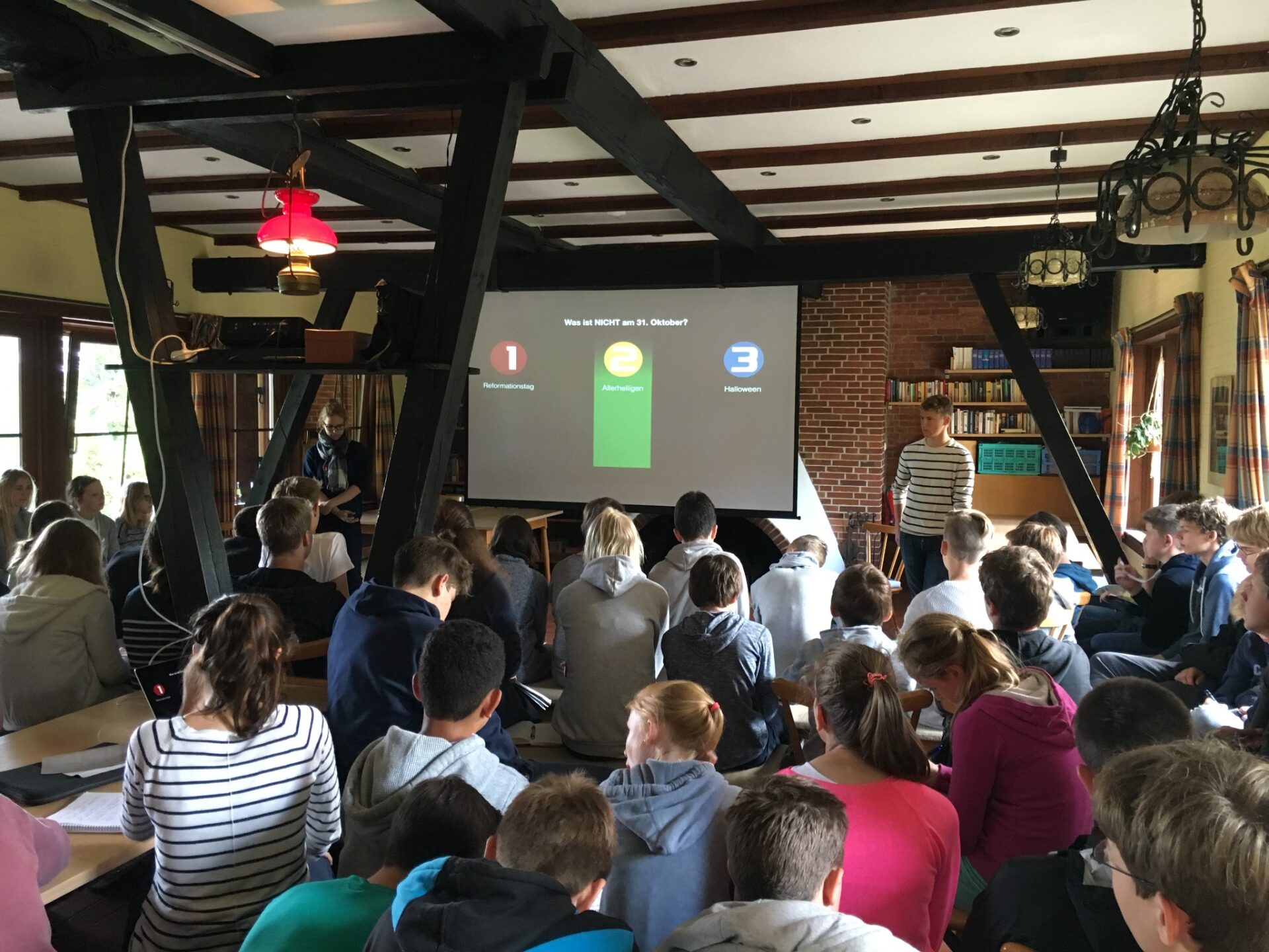 Das prasseln des Regens weckte uns alle frühzeitig aus unserem tiefen Schlaf. Eines war sofort klar: Frühsport fällt aus!!! Als dann die Leiter kamen merkte man an dem Jubeln, dass auch die letzten gemerkt haben, dass es regnet. Nach dem Frühstück klarte das Wetter wieder auf. Perfekt gelaufen! Das Plenum handelte vom Christentum. Wir haben “1,2 oder 3” gespielt. Die Sendung kannten viele daher mussten keine Regeln erklärt werden und es war schnell zu Ende gespielt.