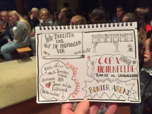 Heute Früh weckten uns die schönen Töne von Moniques Akkordeon. Es ist schon der vorletzte Tag, das heißt, es wird Zeit, um für die Prüfung zu lernen. Nach Frühsport und Frühstück bekamen wir den Zettel, wo alle Fragen die drankommen könnten, draufstehen. Dann hatten wir eine Stunde Zeit sie zu lernen. Eigentlich können wir den ganzen Tag lernen, aber die Zeit war extra dafür bestimmt. Zwischendrin schauten die Zimmer und Zeltleiter vorbei und kontrollierten, ob unsere Antworten richtig waren und ergänzten die fehlenden. Dann war eigentlich schon Mittagessen. Der Nudelauflauf, den es gab, war schnell leer und die Mittagsruhe konnte beginnen. Viele haben erst jetzt die Spiele im großen Tagesraum entdeckt und deswegen spielten viele etwas. Die Mittagsruhe war schnell zu Ende und jetzt sind Pflichtprojekte. Vor unserem eigentlichen Highlight, dem Bunten Abend, sind noch Freizeitprojekte, wo wir Zentanglen und Servietten- Technik machen können, und das große Finale beim Fußball. Leiter gegen Ex Konfis. Am Bunten Abend zeigen dann ein Paar Leute eine Vorführung.