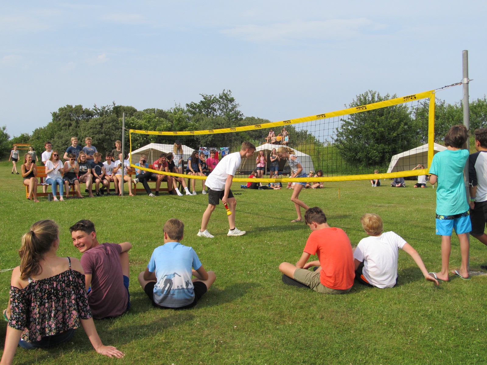 Zum Mittagessen, welches jeden Tag um 12:30 stattfindet, gab es Nudeln mit Hackbällchen. Mittagsruhe folgte dann von 13:30 – 15:00 Uhr. Leckeren Kuchen haben wir um 15:00 Uhr im großen Tagesraum bekommen. Da hinterließen wir eine riesige Schweinerei, welche die LeiterInnen dann wegputzen durften (!). Anschließend begannen um 15:30 die Pflichtprojekte; hier gab es eine große Auswahl zwischen Theater, Tagesschau, Lagerzeitung, Reformation, Liebe in der Bibel, Bibelkrimi, Gartenarbeit, Vorbilder und Blog. Um 16:15 fand ein Indiaca-Turnier statt, welches Ex-Ex-Konfirmand Meric erfolgreich gewann.
