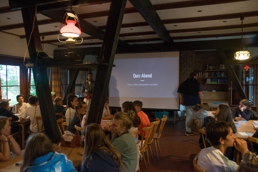 Zum Frühabendprogramm gehörte ein spaßiger Quiz-Abend mit dem Titel: “Scham, Bibel, Hohenfelde und Meer!” Zu den unterschiedlichsten Themen von Adam und Eva, über die Entstehungsgeschichte von Hohenfelde bis zu Entfernung nach Brasilien und Kalifornien wurden die verschiedensten Fragen souverän beantwortet.