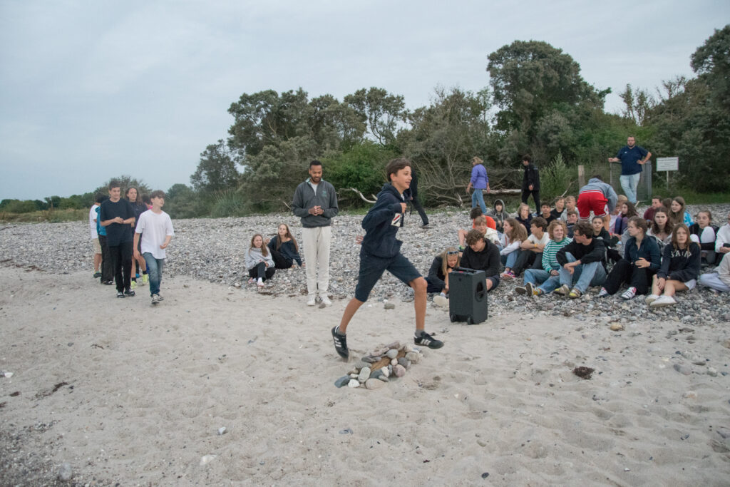 Die am Nachmittag gestalteten Steine wurden, zum Gemeinsamen Abendabschluss, zu einer Mauer geschichtet und alle Konfis sind drüber gesprungen, im Einklang mit Vers aus Psalm 18: „Mit meinem Gott kann ich über Mauern springen“. Um mit der Scham wirklich abzuschließen, haben die Konfis die Steine ins Meer geworfen. Dabei sind manche Steine beeindruckend weit geflogen, ein Stein ist quer zum Strand geflogen und einer sehr hoch und nicht weit. Das war noch einmal eine gute Veranschaulichung, warum die Regel am Strand eigentlich ist, dass keine Steine geworfen werden dürfen.