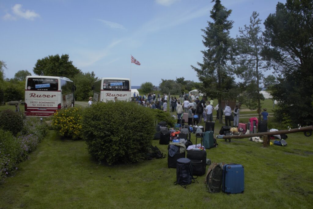 Es ist so weit! Endlich ging es los und eine Schar von Jugendlichen machte sich auf den Weg nach Hohenfelde. Zunächst trafen wir uns am Parkplatz der Kirche und verabschiedeten uns von unseren Eltern. Man munkelt, es sei die ein oder andere Träne geflossen. Doch diese waren schnell durch Vorfreude und Aufregung vergessen. Dann ging es endlich los! Auf der Busfahrt wurden schon viele Spiele gespielt, etwas geschnackt, Musik gehört und letzte „Snaps“, Instagram Stories und WhatsApp Nachrichten verschickt, denn in Hohenfelde angekommen, mussten wir unsere Handys abgeben. Für einige war das nicht leicht. Bald schon sind wir auf unsere Zimmer und Zelte gegangen, haben ausgepackt und die Betten bezogen. Im Anschluss haben wir mit unserer Zimmer- oder Zeltleitung einen kleinen Rundgang über das Gelände gemacht. Dieses besitzt einen Volleyballplatz, ein Fußballfeld, Tischtennisplatten, einen Zeltplatz und sehr viele Möglichkeiten zum Entspannen und Spielen, am schönsten ist es natürlich am Strand direkt hinter unserem Strandtor.