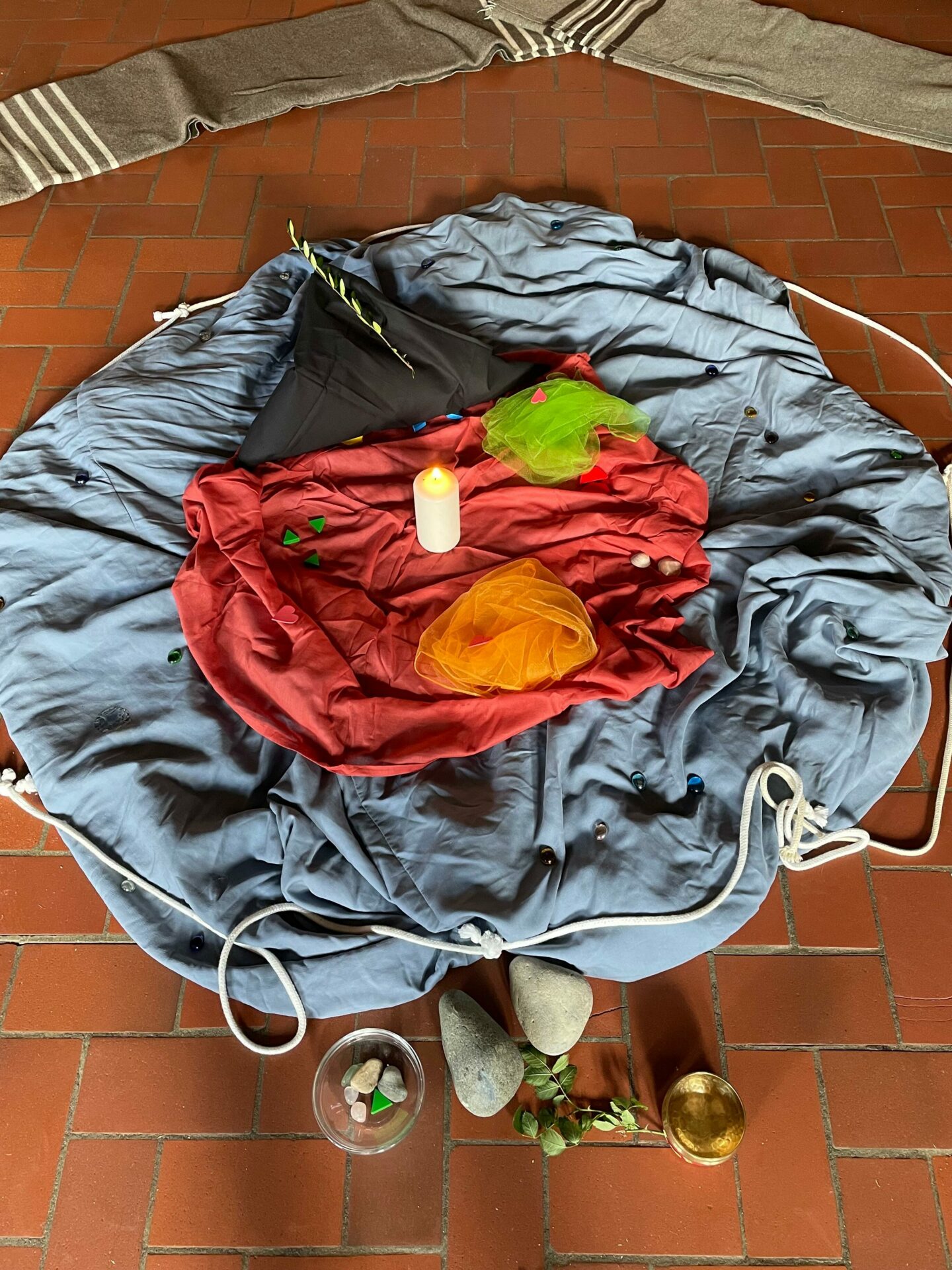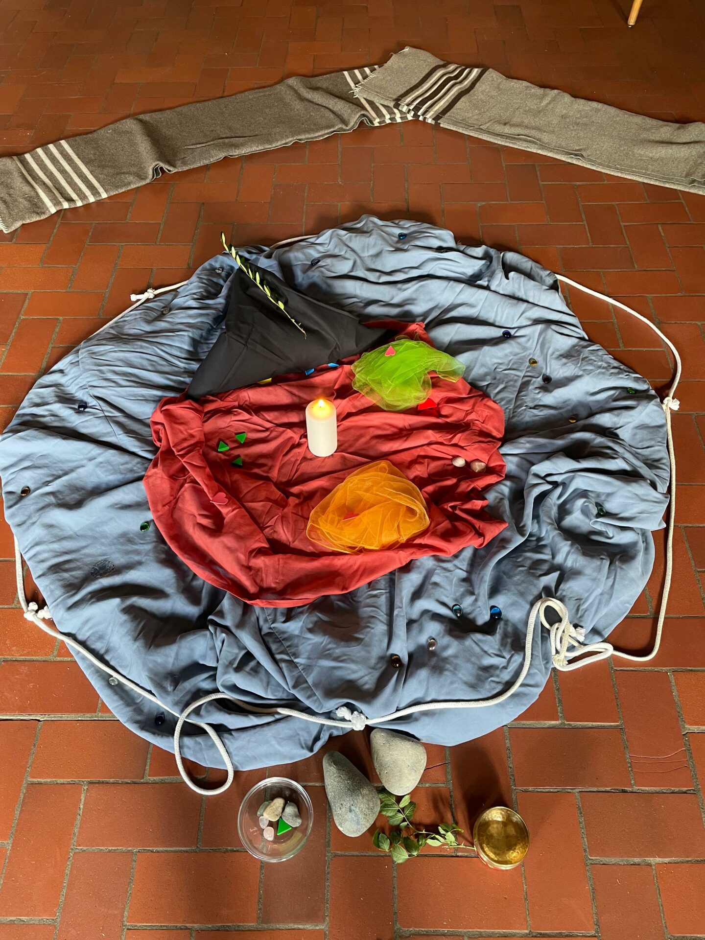 Ein neuer Tag in Hohenfelde! Heute haben wir das Thema Verrat und Vergebung behandelt. Mit Hilfe eines Bodenbilds haben wir Treue und Freundschaft nachempfunden, so wie es Petrus es in der Bibel Jesus zugesagt hatte. In kleineren Gruppen haben wir im Kreis an einem Strang gezogen und waren miteinander verbunden. Dann ging die Geschichte weiter: Als es drauf ankommt, verlassen die Freunde Jesus. Jesus wird verhaftet und Petrus gibt vor, ihn nie gekannt zu haben. Jetzt ist die Freundschaftskerze in der Mitte verloschen, das Seil ist zum Strick um die Kerze geworden, ein schwarzes Tuch liegt über der Erinnerung. Dann liegen da schwere Steine und Dornen, weil Petrus sich so schlecht fühlt. Als dann der Hahn kräht und Petrus sich an die Worte Jesu erinnert, weint er bitterlich. Tränen-Formen liegen jetzt auf dem Tuch. Wir haben dann Papier in Form einer Träne bekommen und aufgeschrieben, wann wir uns schonmal so gefühlt haben wie Petrus. Zum Glück endet die Geschichte schön. Wir sind nochmal zusammengekommen und haben gehört, wie Jesus nach seiner Auferstehung zu Petrus kommt und ihm vergibt. Ein grüner Zweig liegt auf dem halb aufgedeckten Tuch und drei rote Herzen, denn dreimal versichert Petrus, wie lieb er Jesus hat und dass er die Kirche in seinem Namen gründen wird.