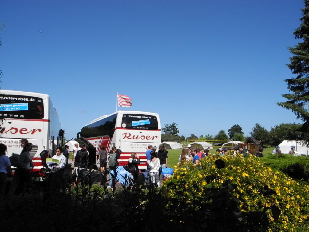 Mit ein bisschen Stau und einer Pause kamen wir nach vier Stunden in Hohenfelde an. Wenn wir die Strandstraße hinunterfahren und das Meer erblicken, läuft traditionell durch die Lautsprecher „Heart of Courage“. Einige Jugendleiter, die zwei Tage vorher vorausgefahren sind und alles für uns vorbereitet haben, haben unsere Busse mit wehenden Fahnen am Eingang begrüßt.