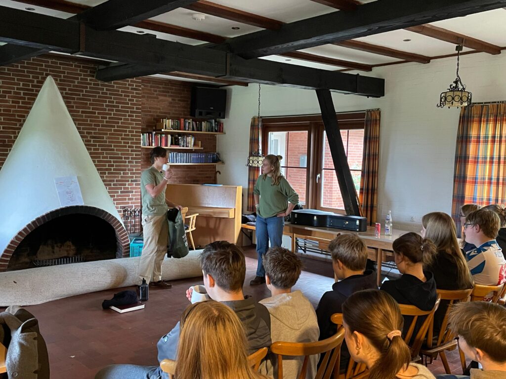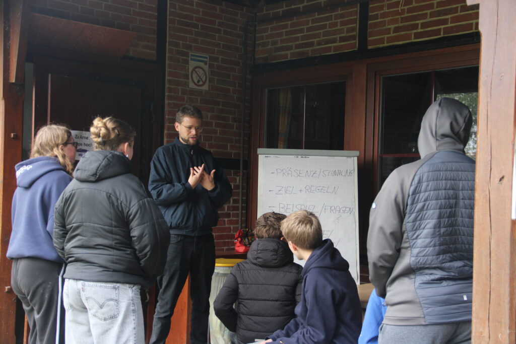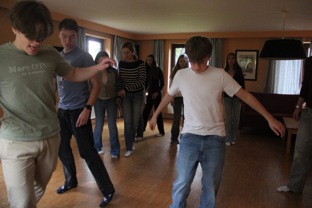 In vier verschiedene Workshops konnten die Jugendlichen zudem einzelne Fähigkeiten vertiefen. Eine Gruppe hat im Kleinen Tagesraum an einem Standardtanzkurz teilgenommen und die Grundschritte von Cha-Cha-Cha und Discofox gelernt. Im Spielehaus hat eine Gruppe mit Quasselrunde, Assoziationsspiel und Mini-Reden das Sprechen vor der Gruppe geprobt. Über das ganze Gelände verteilt hat eine weitere Gruppe sich im Spiele Anleiten geprobt. Beim vierten Angebot haben die Teilnehmenden sich bewusst Zeit für sich genommen. Dabei ging es darum zu proben, wie man auch im Alltag eine ruhige Pause machen kann.