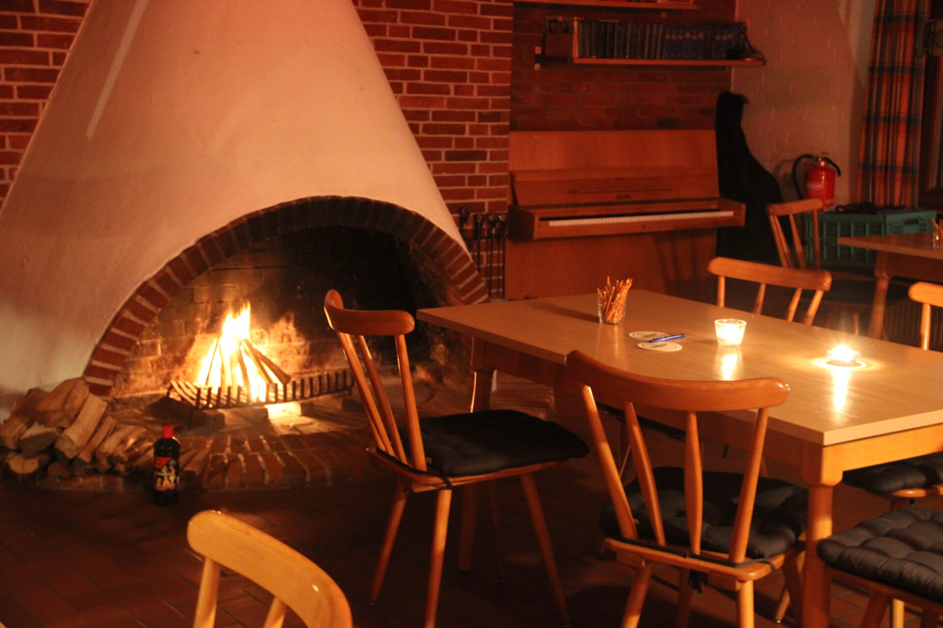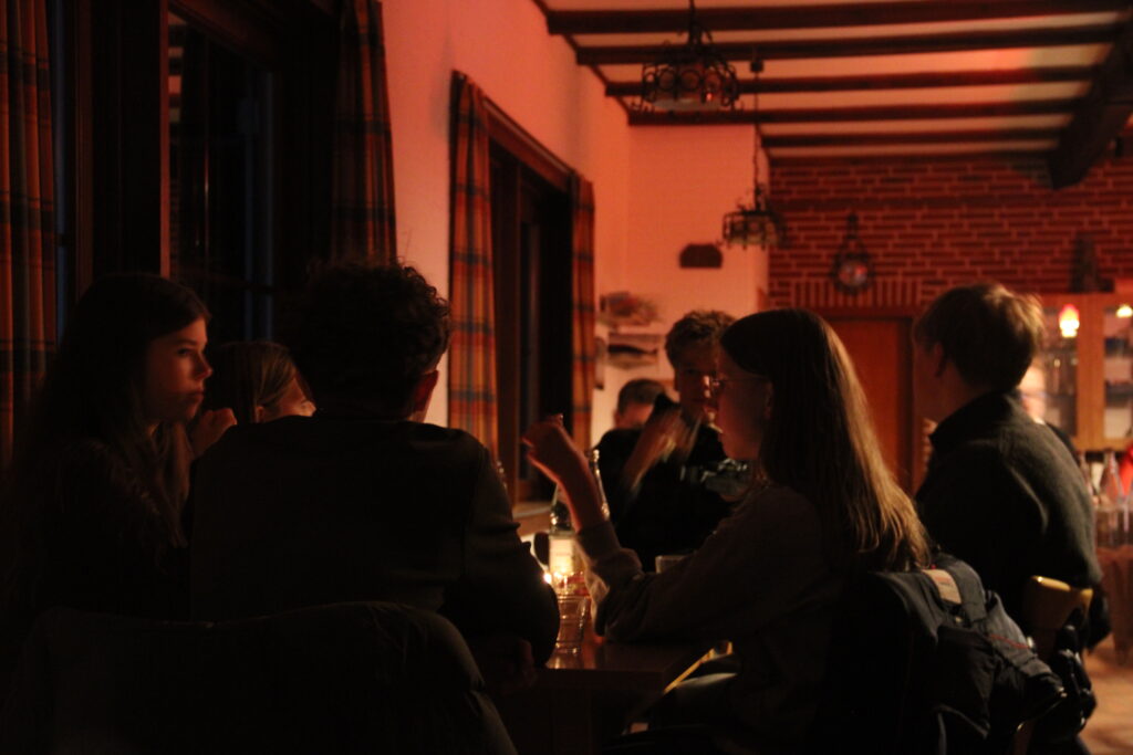 Zum letzten Abend der Freizeit steht nochmal eine gemeinsame Aktion an. Freizeitleitung Arne lädt zum Kneipenquiz in den Großen Tagesraum ein. Es gibt Snacks, Getränke und zahlreiche Quizfragen. Im Kamin brennt ein kleines Feuer, aus den Lautsprechern kommt Musik. Es wird sich unterhalten, Karten gespielt und ordentlich gerätselt.