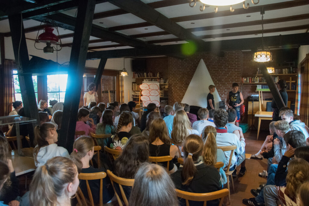 Angst gab es in großem Maße diesen Morgen vor dem angekündigten Inhaltsblock: dem Plenum. Anstatt des gefürchteten, stundenlangen Bankdrückens warteten jedoch zwei spannende Gäste auf die Konfis: Zwei Schauspieler*innen nahmen den weiten Weg aus Kiel auf sich. Zwei Stunden lang wurden die Konfis auf eine Entdeckungsreise durch die Gefühlswelt und ihren Körper geführt mit verschiedensten Improvisationsspielen. Von Liebe zum BigMac, Traurigkeit in der Sauna, Ekel über den Geruch vom neuen Mercedes oder Erschrockenheit über Feuerkreaturen wurden alle erdenklichen Situationen empathisch erkundet.