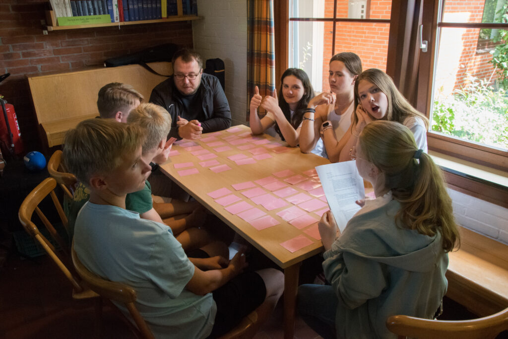 Nach dem Frühstück startete auch schon das Plenum. Die Konfirmand: innen lernten darüber, warum Regeln und Gesetze für uns so wichtig sind und wie das Leben ohne sie aussehen würde. Weiter ging es in einer Gruppenarbeit. Die Aufgabe war es Regeln aufzustellen, die in Hohenfelde wichtig waren. „Die 10 Regeln für Hohenfelde“. Zusammen kamen Regeln, wie ein respektvoller Umgang und immer auf die Leitenden hören. Ja… tatsächlich.